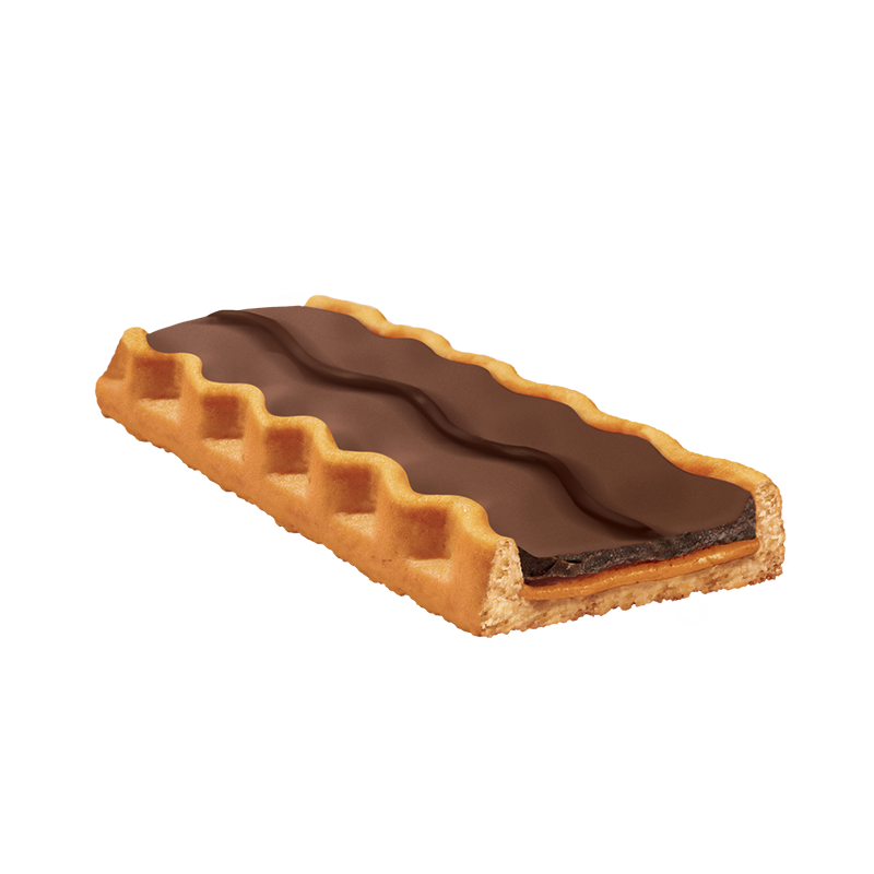 Crispy biscuit bar with caramel filling and peanut pieces, topped with milk chocolate.