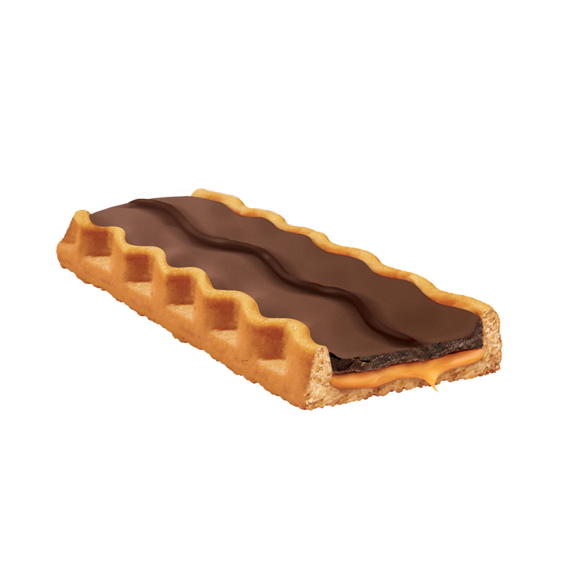 Krokante biscuitreep met caramelvulling en melkchocolade.